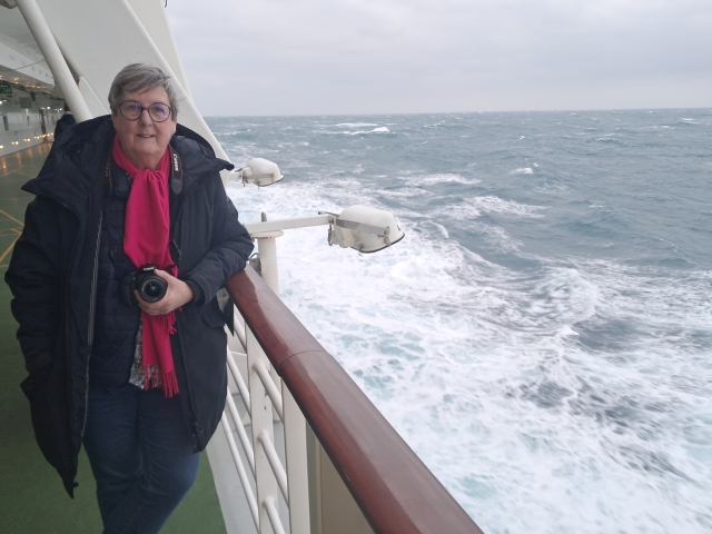 | Ingeborg auf dem Balkon unserer Kabine 8203. (da, wo die Türe offen ist) | |