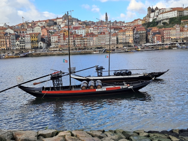 | DIe Stadt Porto: schöne alte Häuser, mit Fassaden, die oft mit tollen Azulejos / Fliesen geschmückt sind. Mit solchen Booten wurden die Fässer mit Portwein aus dem Landesinneren über den Fluss Duoro transportiert. |