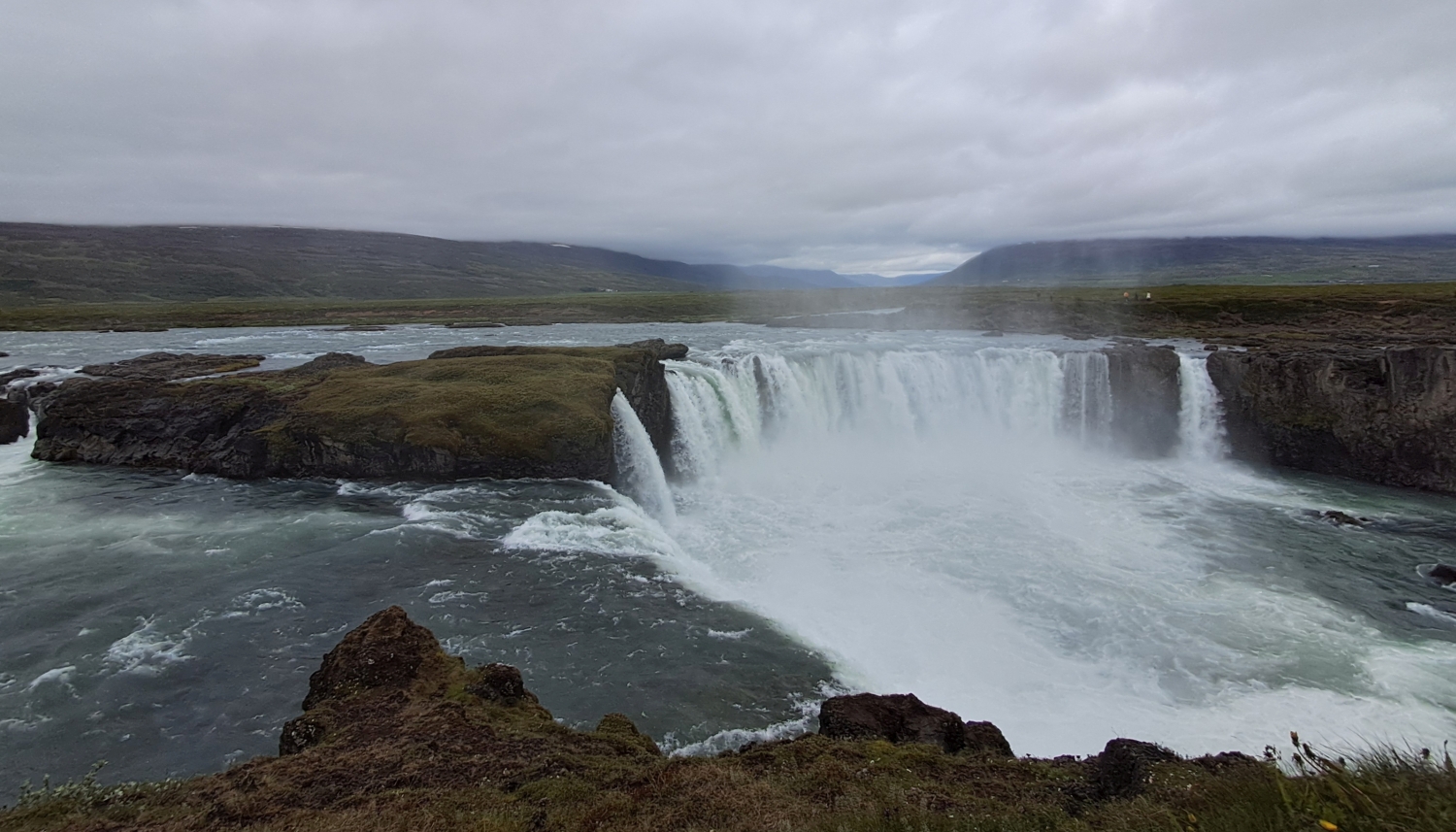 Gletscher Vatnajökull. Godafoss heißt der Wasserfall, weil der Gode und