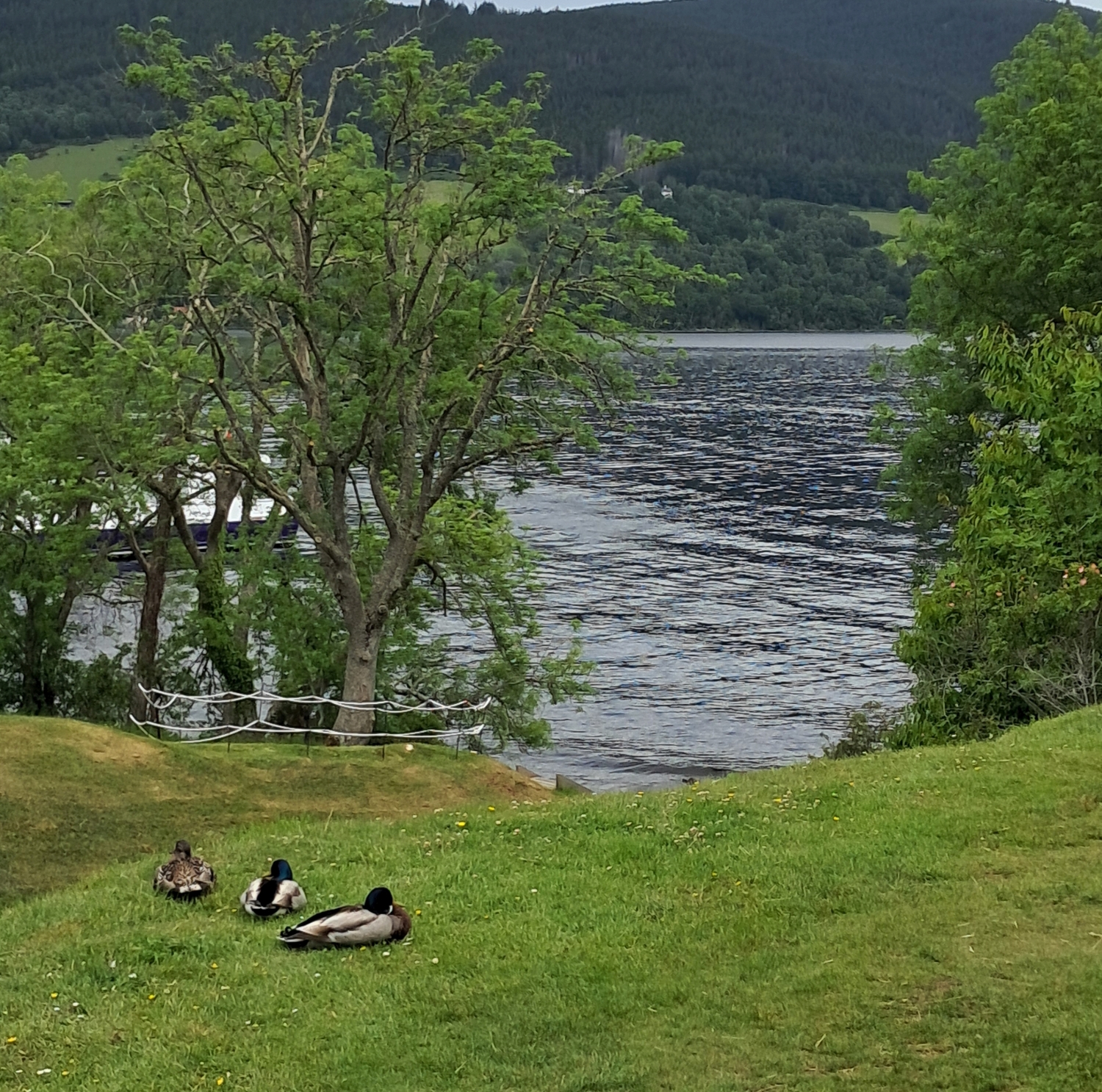 | Nessie hatte sich hinter dem rechten Gebüsch versteckt. Beweis: die Enten hatten sich vor ihr ans Land geflüchtet. In der dortigen Snackbar gab es seltsamerweise schmackhafte Sandwiches mit Salat zu einem halbwegs vernünftigen Preis. |