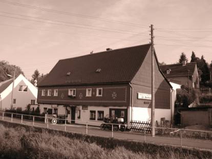 in Chemnitz zu ersetzen. 2.Tag: Also brachen wir von Ansprung Richtung Chemnitz auf. Einige Kilometer weiter meldete Moni an eine roten Ampel einen bösen Spannungsabfall. Beim Anlassen leuchtete die Ladekontrolle nicht auf: Der erfahrene BMW – Gummikuh – Treiber und auch die Besitzerin diagnostizierten einen defekten Lichtmaschinen – Rotor.... Na, so was kann uns schon lange nicht mehr erschüttern, dieses Teil in der Größe eines Granny – Smith – Apfels hat man halt dabei, und der Austausch dauert eine halbe Stunde. So brachten wir Moni’s Kuh zurück nach Ansprung, und nahmen erneut Anlauf – diesmal halt zu zweit auf einer Kuh. In Chemnitz gab es den Spiegel nicht, aber in Dresden gäbe es deren zwei, meinte der Computer bei der BMW – Niederlassung. Also verlängerten wir die Spiegel – Einkaufs – Tour halt dorthin, bekamen das Teil 10 Minuten vor Feierabend und wackelten heim. So ein Lichtmaschinen– Rotoren – Wechsel ist eigentlich kein Problem, wenn man das kleine Spezialwerkzeug – eine vorne abgefeilte Schraube – dabei hat. Ich habe so was immer dabei, leider gefiel es der Schraube andernorts besser als in meiner Werkzeugtasche, sie hatte sich verdünnisiert. Wat nu? Freund Dixi aus Borstendorf brachte Hilfe und Schraube, und bald war alles wieder heile. Abends gab es noch einen langen Traatsch mit Bekannten aus Ansprung. 3.Tag: Unsere Kühe schwangen ihre Hufe quer durchs Erzgebirge. Gutes Wetter und die im Osten allgegenwärtigen Umleitungen (aber auch bei uns in Bayern lernt man in dieser Hinsicht bereits von den Ossis) sorgten für eine schöne und abwechslungsreiche Fahrt bis zur Elbe, die wir bei Pirna kreuzten. Dann ging es weiter über Neustadt / SA in Richtung Zittau. Langsam wurde es Zeit zur Quartier – Suche. In Neusalza – Spremberg stand eine kleine Gastwirtschaft direkt jenseits eines Bächleins. Wir hielten an, die lila gefärbte Wirtin kam heraus und hatte auch ein Zimmer für uns. Moni zog nicht so recht, aber ich fand die Frau herrlich, das Zimmer war in pink und türkis. An der Wand hing der obligate röhrende Hirsch, ein Bild eines Pajero mit Uhr und eine feenhafte Süße die mit ihrem Schimmel schmust. Auch ein Rehbock – Krickerl durfte nicht fehlen, ich verkniff mir es daran meine Socken zum Lüften auf zu hängen. Die Wirtschaft wird es nicht mehr lange geben, der Herr des Hauses ist schwer krank, die Jugend des Ortes hat sich andere Treffpunkte ausgesucht. Das Bächlein ist die Spree, die Wirtin gab uns ein paar Tipps für Ausflüge und bald waren wir ins Zittauer Gebirge unterwegs. |