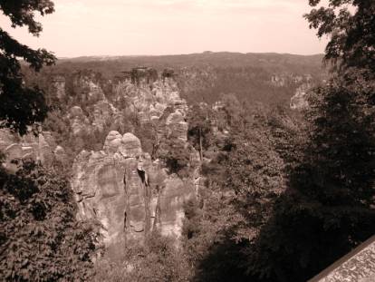 Garnicht weit weg liegt die Bastei, ein Gewirr von Sandstein – Felsen hoch über der Elbe. Wir fuhren auch dorthin. Jede Menge Trubel herrscht dort oben, alle Völker treffen sich dort, und Geschäftsleute führen ihren Besuch dorthin. Mit Motorradkleidung ist es etwas schweißtreibend, auf die Begehung eines Pfades rund um die fast nicht sichtbaren Anlagen einer alten Burg verzichteten wir. Aber die Aussicht ist herrlich!Bald aber türmten sich drohende Gewitterwolken über der Pracht auf und erinnerten uns daran dass der Wetterbericht etwas von Sturm und Blitz und Hagel erzählt hatte. Das dräuende Ungemach verfolgte uns ständig, jede von der Strasse erzwungene Wende brachte es uns näher, jede längere Gerade in die richtige Richtung sorgte wieder für Distanz.Kaum waren wir an der Spreeklause angelangt, brach die Flut von oben los. | ![]() ![]() |