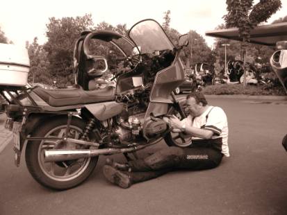 7.Tag:Die Bordspannung an Moni’s BMW hielt durch, und wir erreichten Görlitz. Leider gibt es dort keinen BMW – Motorradhändler und wir mussten weiter nach Dresden. Wir kauften einen neuen Regler, aber ohne Ergebnis. Wir bauten auf dem Firmenhof das Motorrad auseinander, hilfreiche Monteure fingen an zu testen, und fanden heraus dass das Ladekontroll – Birnchen hin sei. (wir hatten es gestern noch für gut befunden) Allein, auch ein neues Birnchen war nicht die Lösung. Prüfen aller Leitungen war angesagt. Kein Defekt auffindbar, alles wie es sein sollte, doch allem Anschein nach funktionierte der Regelkreis zwischen Rotor und Regler nicht. Da fiel dem Monteur ein dass es irgendeine vertrackte Verbindung zwischen Gleichrichterplatte und Regler gibt. Also bauten wir wieder nach Anleitung die Gleichrichterplatte aus, der Monteur testete sie und tatsächlich, eine „Steuerdiode“ deren Zweck mir bis heute schleierhaft ist war in die ewigen Jagdgründe gegangen. So eine Diodenplattel hat der erfahrene BMW – Gummikuhtreiber natürlich dabei (kurz vorher im Internet ersteigert), nur war uns dieses Symptom halt völlig unbekannt.... Eigentlich soll die Lichtmaschine bei einer defekten Gleichrichterplatte nur noch unzureichend laden, und dies soll sich durch ein glimmendes Ladekontroll – Birnchen bemerkbar machen. Bei uns war es ja geradezu umgekehrt: Die Lichtmaschine lud und das Birnchen weigerte sich zu leuchten. Warum das Birnchen dann überhaupt noch leuchten muss? Keine Ahnung.... Der Defekt wurde repariert und wir krochen ziemlich frustriert im Dresdner Etap – Hotel unter. Was sollten wir mit unserem Urlaub jetzt machen? Wieder zurück nach Polen? Irgendwie in Tschechien rumeiern und die Tour weiter fahren, dabei fernab von jedem Ersatzteillager ein endgültiges Aus riskieren? | ![]() |