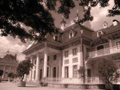 Es ist umgeben von einem schönen Park, im Inneren sind Ausstellungen