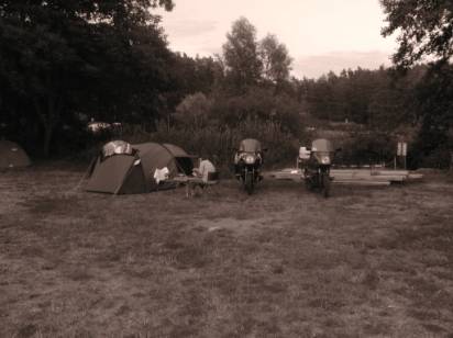 9.Tag: Die entscheidende Frage, wie geht’s mit unserem Motorrad – Urlaub weiter, beantwortete sich beinahe nebenher: Nach einem Tag ohne Mopped juckte die Gashand und wir beschlossen auf Ersatzteil – sicherem deutschen Terrain zu bleiben und nach MeckPomm an irgendeinen See zu reisen. So geschah es denn auch: Strenge Vorgabe war es nur auf Landstraßen zu reisen, und das hielten wir auch durch. Die Umfahrung von Berlin dauerte allerdings richtig lange, mittendurch wollten wir nicht. Ausserdem kosteten die vielen Dörfer und Stadtchen, sowie eine Motorradausfahrt mit Polizeibegleitung in die wir gerieten über fast 20 km richtig Zeit. In irgendeinem Käfflein nahe Treuenbrietzen wollte ich bei der Ortseinfahrt bremsen, meine Gummikuh trudelte aber lustig weiter. Ein Inspektion der Bremse ergab: Gabelsimmerringe so undicht dass das Gabelöl in die Bremse gelaufen war! Oh je, das auch noch. Auch an Monis Kuh zeigte sich bereits ein deutlicher Ölnebel an den Standrohren. Der Tag neigte sich ausserdem dem Ende zu und Quartier hatten wir auch keins. Die Nachfrage ergab dann in einer Plattenbausiedlung in Neustrelitz 70.-€ /Nacht in einem Hotel das im ersten Stock eines Einkaufszentrums gelegen ist. Es machte zwar auf „fein“ hatte aber nicht mal einen eigenen Parkplatz.... So suchten wir weiter und fanden den Campingplatz „Naturfreund“ nahe Kratzeburg am Käbelicksee. Der Name klingt in meinen Ohren nach FKK, ist aber keiner. Dafür liegt er im Müritz – Nationalpark, ist einfach aber mit Dusche, WC, und ein bisschen Einkaufsmöglichkeit versehen. Der Käbelicksee ist sehr abseits gelegen, daher völlig ruhig und auch nicht überlaufen. Der Sandstrand ist sauber und das Wasser herrlich. |