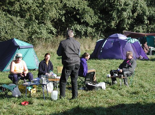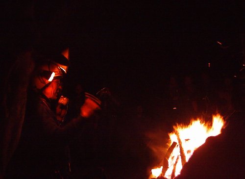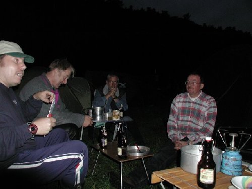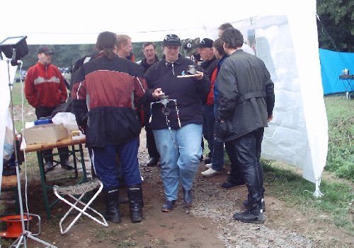 | Abends am Lagerfeuer wurden die üblichen Zeremonien abgehalten.Unsere Samstag – Abende sind meist etwas kürzer als die Freitag - Abende, weil Sonntags ja normalerweise wieder eine Mords – Heimfahrt bevorsteht.... und das sonntägliche Frühstück fand in der Wirtschaft statt, sodass wir uns recht bald auf den weiten Heimweg machen konnten. | ![]() |