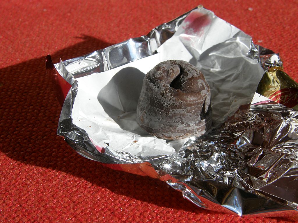 hätten wir doch gedurft. Morgens bekamen wir dafür dann den Katzentisch, entweder im Durchgang oder wo es sonst unbequem war. Plätze hätte es genug gegeben. Klar, dass wir dann abends wieder auswärts speisten. Zum Abschied bekamen wir dann die hier abgebildete kulinarische Köstlichkeit aufs Kopfkissen serviert. Das Zimmer war sehr hübsch. |
