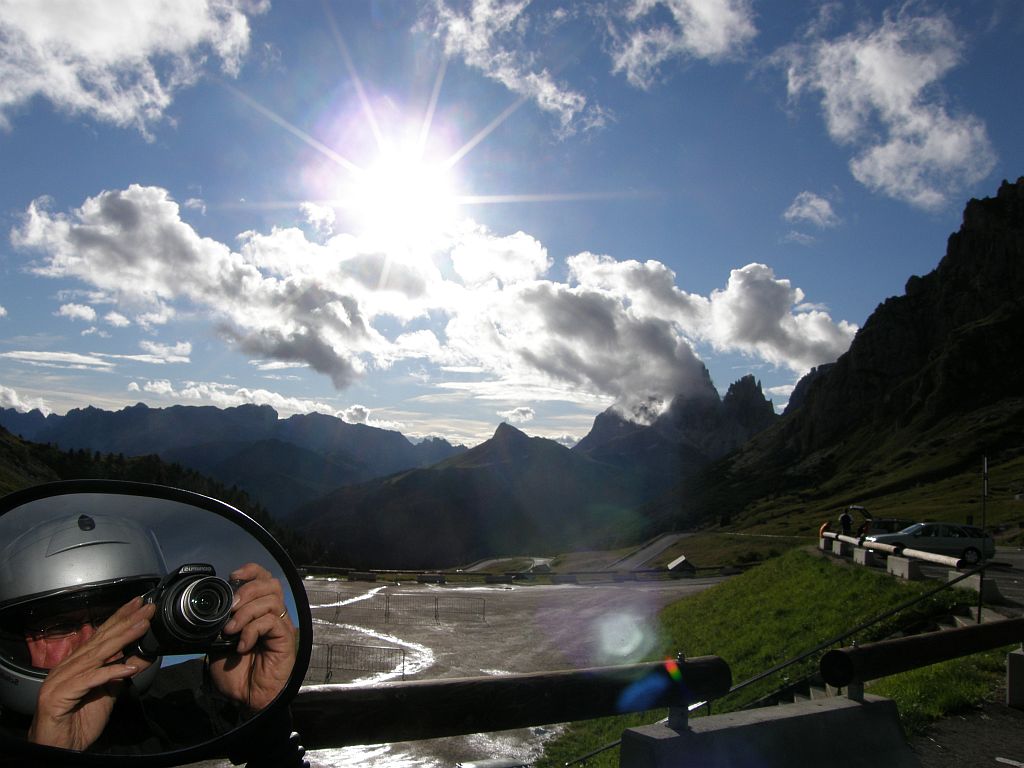 | Der darauf folgende Tag begann mit kräftigem Regen, der sich erst gegen Mittag verzog. Wir lenkten den Mischa gen Canazei, und eher versehentlich gerieten wir auf den Fedaia - Pass - eigentlich wollte ich ja die klassische Sella - Runde fahren, aber die meisten bogen links ab, da fuhr ich rechts. Eh wurscht, die Landschaft ist immer beeindruckend. Am Fedaia - Stausee gab es einen guten Apfelstrudel.... | ![]() |
